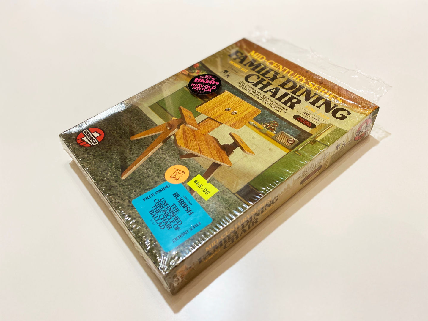 Rubbish Famzine is a bi-annual family zine consisting of dad - Pann, mom - Claire, and their son, Renn & daughter, Aira. This is the latest issue of the limited edition zine produced by Pann and Claire Lim and their children Renn and Aira. This time the theme is 'chairs', and the hand-finished printed zine comes with a hobby kit model of a mid-century chair.